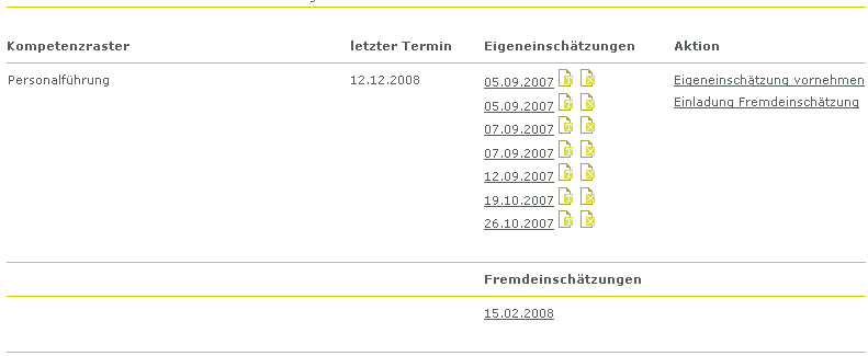 Sie können jederzeit Ihre Eigen- und Fremdeinschätzungen begutachten. Dazu klicken Sie bitte direkt auf das Datum einer Einschätzung.
